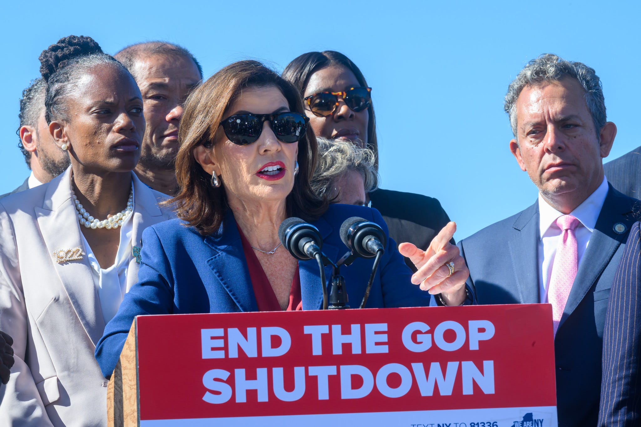 Gov. Kathy Hochul rallied with Democrats in New York City Wednesday in support of Senate Minority Leader Charles E. Schumer and House Minority Leader Hakeem Jeffries, both Brooklyn Democrats who blocked an extension of current spending.
