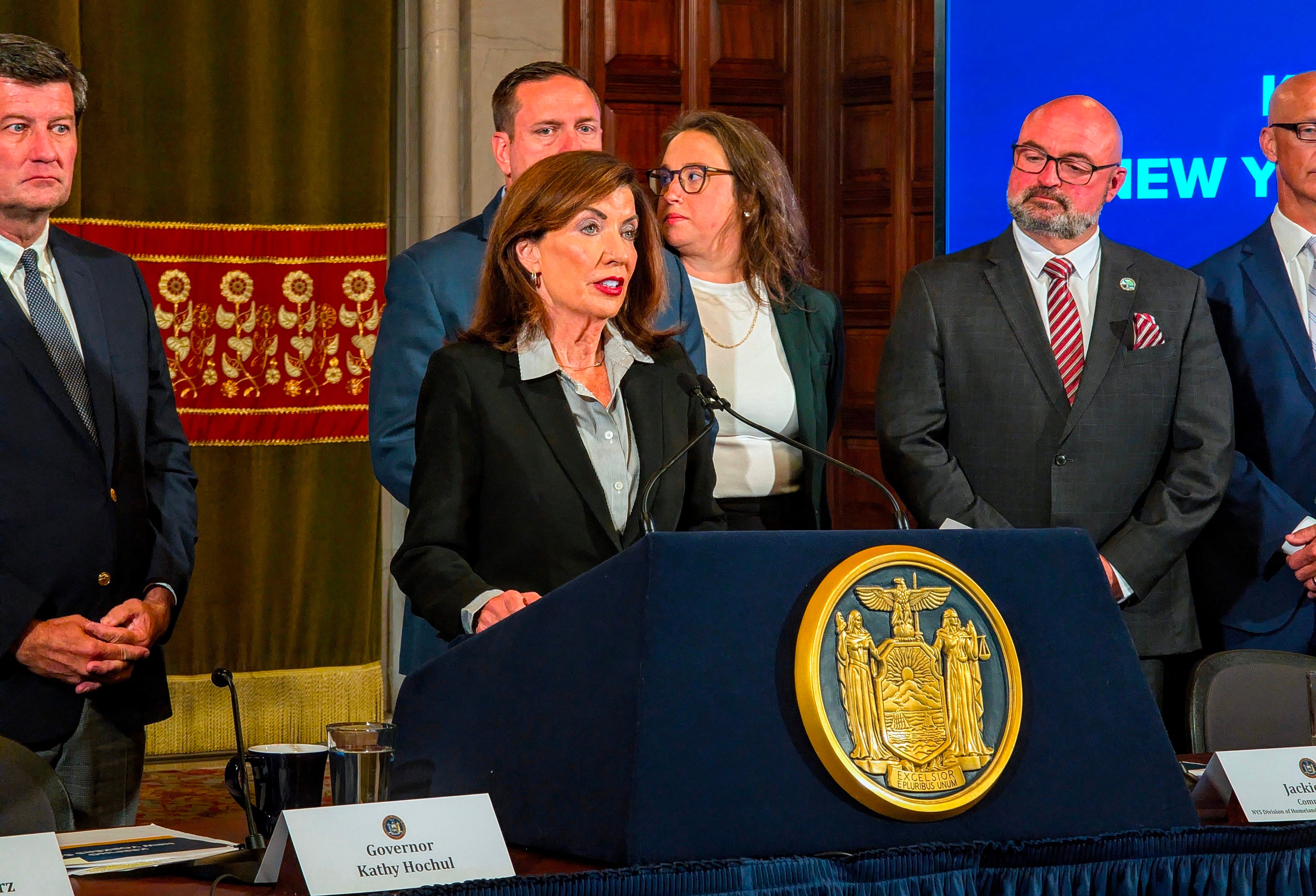 She was joined in person by Dutchess County Executive Jen Metzger and Erie County Executive Mark Poloncarz, both Democrats, and Orange County Executive Steve Neuhaus and Chautauqua County Executive Paul “PJ” Wendel, Jr., both Republicans.