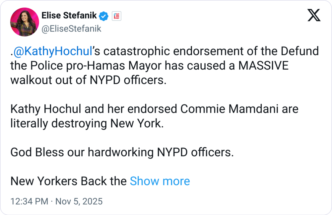 “(Gov. Kathy Hochul’s) catastrophic endorsement of the Defund the Police, pro-Hamas Mayor has caused a MASSIVE walkout of NYPD officers,” Stefanik wrote. “Kathy Hochul and her endorsed Commie Mamdani are literally destroying New York.”